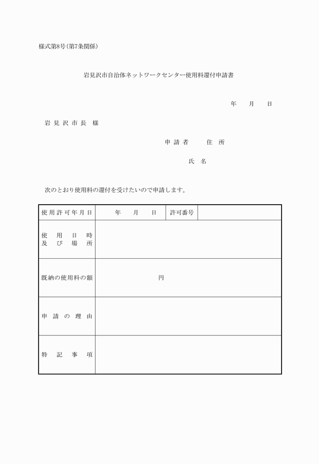 3 使用料の還付を受けようとする者は、岩見沢市自治体ネットワークセンター使用料還付申請書(様式第8号)を市長に提出しなければならない。