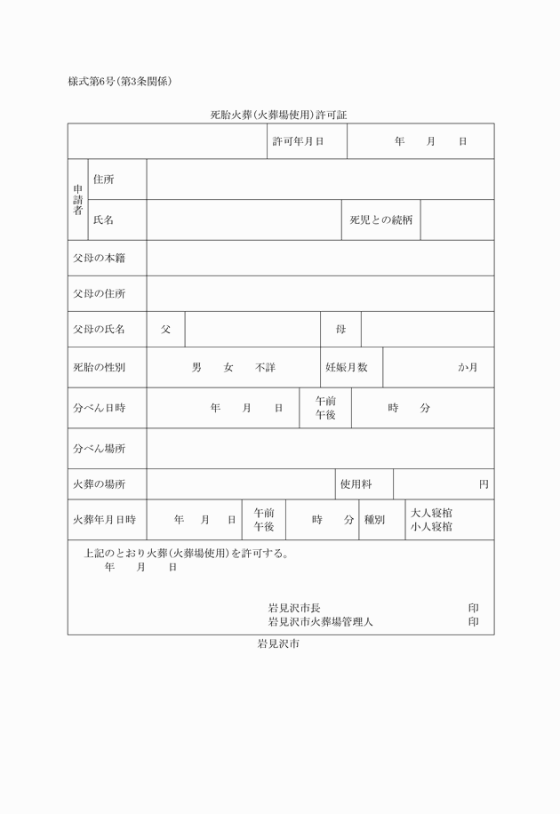 第6条 使用者は、使用許可を受けた後において、当該施設を使用する必要がなくなったときは、火葬場使用許可取消申出書(様式第11号)を市長に提出しなければならない。