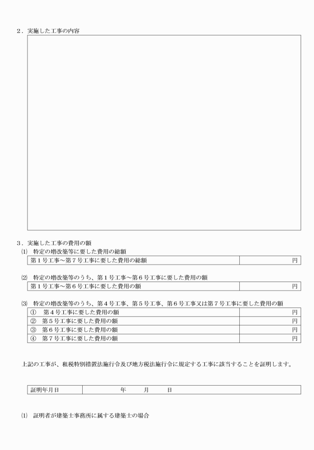 (7) 租税特別措置法施行令第42条の2の2第2項に規定する特定の増改築等がされた住宅用家屋の所有権の移転登記の税率の軽減を受けるために証明を受けようとする場合は、宅地建物取引業法(昭和27年法律第176号)第2条第3号に規定する宅地建物取引業者から証明の申請を受けた建築士(建築士法第23条の3第1項の規定により登録された建築士事務所に属する建築士に限るものとし、当該申請に係る住宅用家屋が同法第3条第1項各号に掲げる建築物であるときは一級建築士に、同法第3条の2第1項各号に掲げる建築物であるときは一級建築士又は二級建築士に限るものとする。)、建築基準法第77条の21第1項に規定する指定確認検査機関、住宅の品質確保の促進等に関する法律第5条第1項に規定する登録住宅性能評価機関又は保険法人が、当該申請に係る工事が租税特別措置法施行令第42条の2の2第2項第1号に規定する増築、改築、大規模の修繕若しくは大規模の模様替、同項第2号に規定する修繕若しくは模様替、同項第3号に規定する修繕若しくは模様替、同項第4号に規定する修繕若しくは模様替、同項第5号に規定する修繕若しくは模様替、同項第6号に規定する修繕若しくは模様替又は同項第7号に規定する修繕若しくは模様替に該当する旨の増改築等工事証明書(様式第4号)。ただし、租税特別措置法施行令第42条の2の2第2項第7号に掲げる工事に要した費用の額が50万円を超える場合においては、増改築等工事証明書に加えて、当該家屋について交付された既存住宅売買瑕疵担保責任保険契約(次のア及びイに掲げる要件に適合するものに限る。)が締結されていることを証する書類