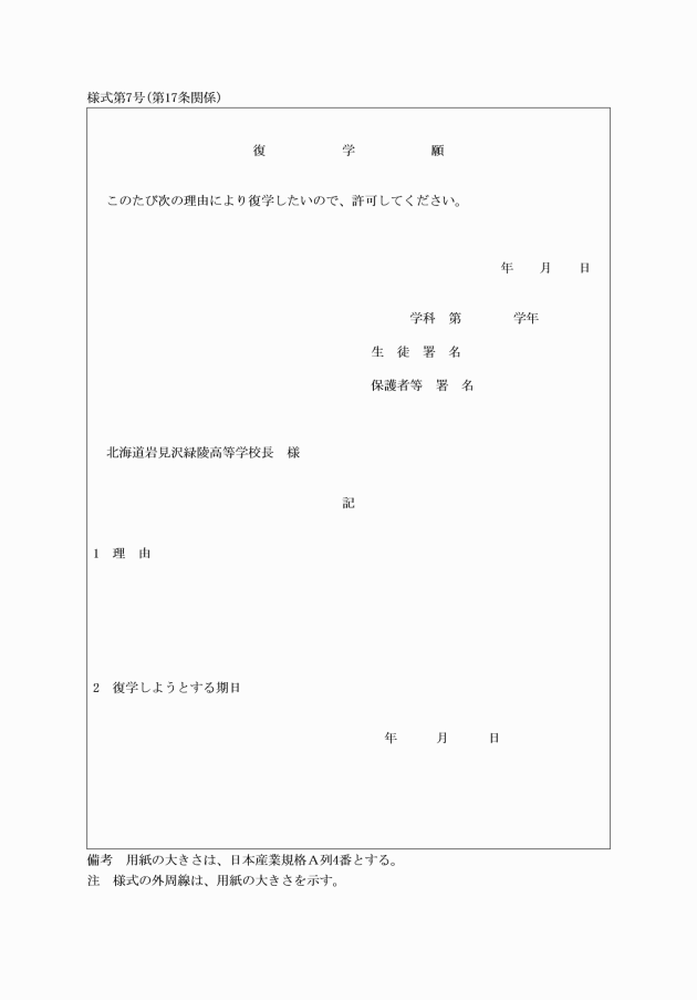第17条 休学中の生徒が復学しようとするときは、様式第7号の願書により校長に願い出て許可を受けなければならない。