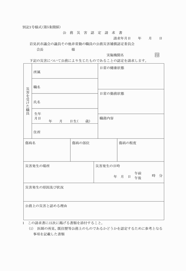 第5条 実施機関は、条例第3条第3項の規定により認定委員会の意見を求める場合は公務災害認定請求書(別記1号様式)を提出しなければならない。