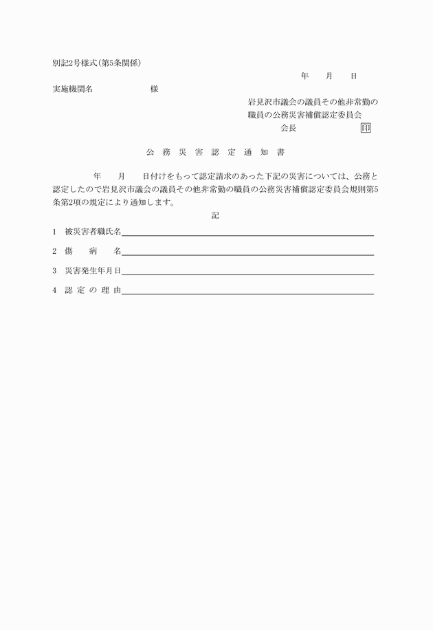 2 認定委員会は、前項の規定により認定について意見を求められた場合は、その認定を行い、公務災害認定通知書(別記2号様式)により通知を行うものとする。