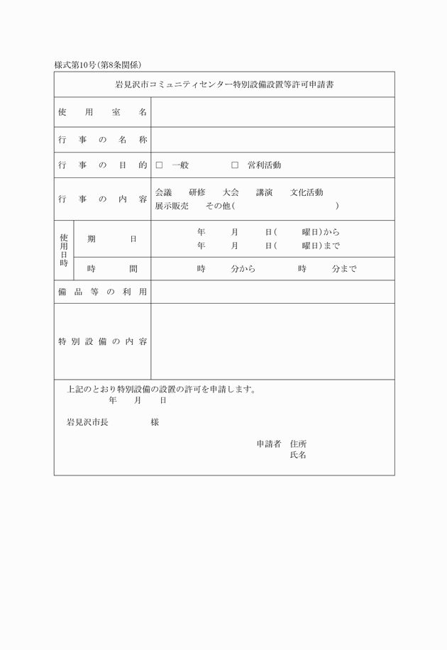 第5条 条例第6条第2項ただし書の規定により使用料の後納の許可を受けようとする者は、岩見沢市コミュニティセンター使用料後納許可申請書(様式第4号)を市長に提出しなければならない。
