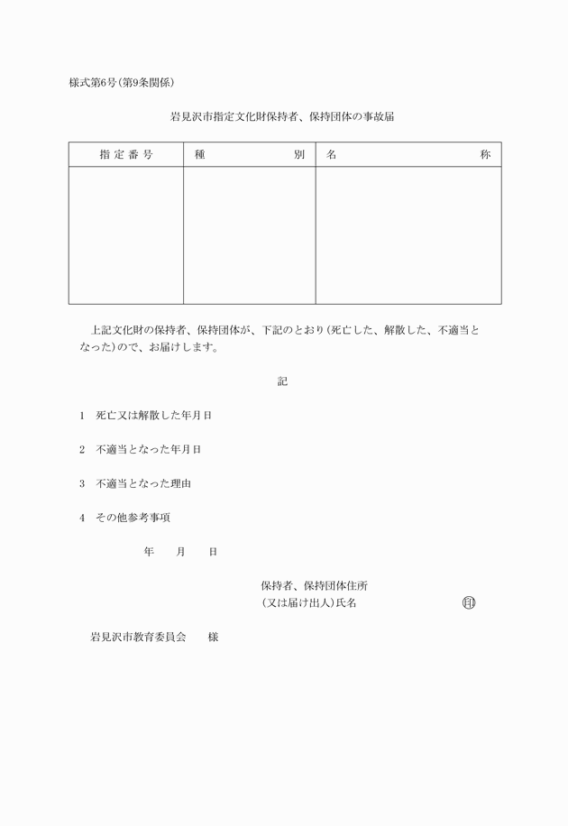 第7条 所有者等が指定書を紛失又はき損したときは委員会に岩見沢市指定文化財指定書再交付申請書(様式第4号)を提出し、指定書の再交付を求めることができる。