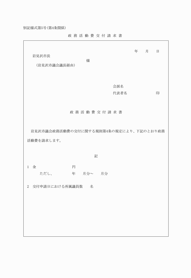 第4条 会派の代表者は、政務活動費の交付日の10日前までに、市長に対し別記様式第5号により政務活動費交付請求書を提出するものとする。