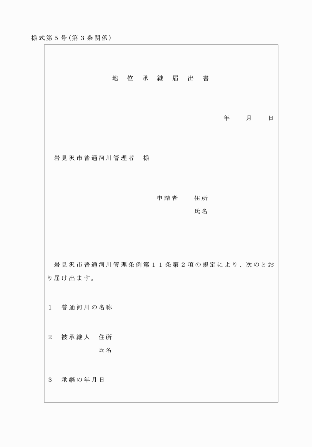 (5) 普通河川管理者以外の者がその権原に基づき管理する土地において草木の栽植又は伐採を行う場合にあっては、当該草木の栽植又は伐採を行うことについて申請者が権原を有すること又は権原を取得する見込みが十分であることを示す書面