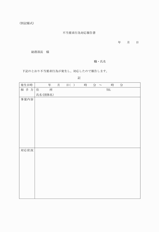 3 不当要求行為のうち、重要又は全庁的な影響がある案件については、不当要求行為対応報告書(別記様式)により、不当要求行為対策責任者に報告するものとする。