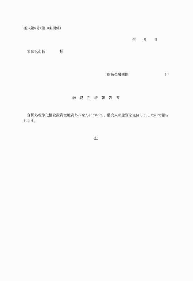 第8条 融資の決定を受けた申込者が、当該工事を完了したときは、完了届出書(様式第5号)により速やかに市長に届け出なければならない。