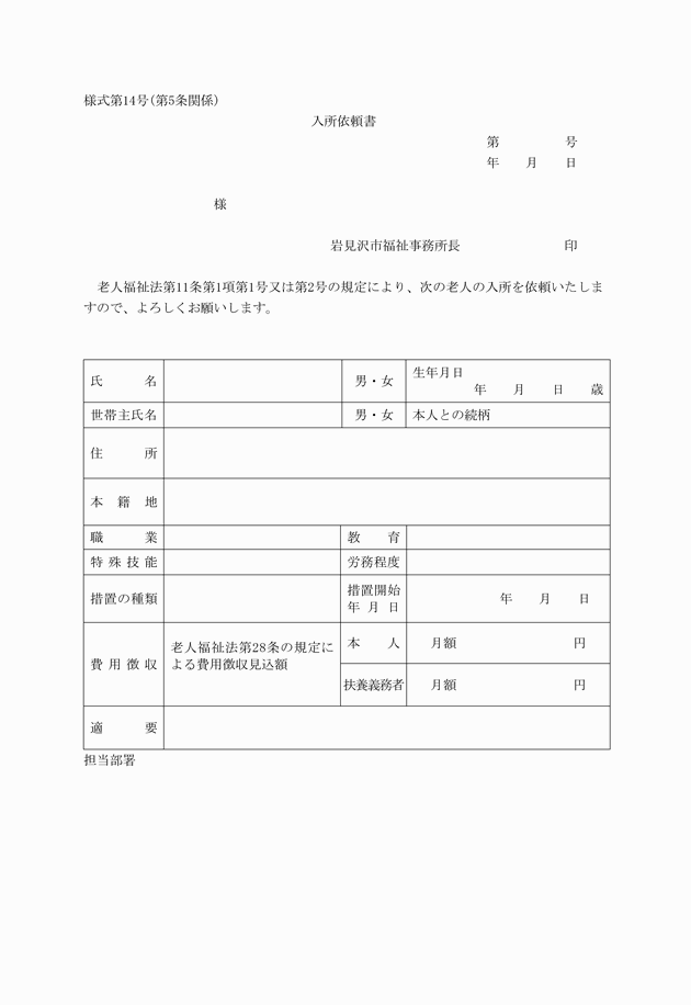 第2条 福祉事務所長(以下「所長」という。)は、法第10条の4第1項若しくは第2項又は法第11条第1項の規定により措置を行うときは、当該措置の対象者(以下「被措置者」という。)について措置台帳(様式第1号)を作成し、当該措置を廃止し、又は停止するまでの間、常にその記載事項を最新の内容に整理しておかなければならない。