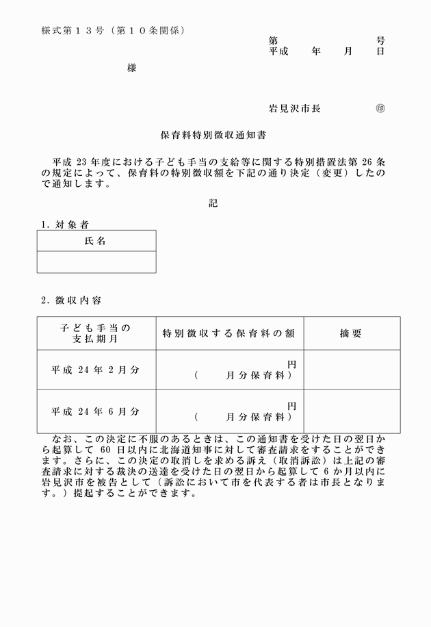 第10条 市長は、法第26条の規定に基づき、子ども手当から保育料を徴収するときは、保育料特別徴収通知書(様式第13号)により受給者に通知するものとする。