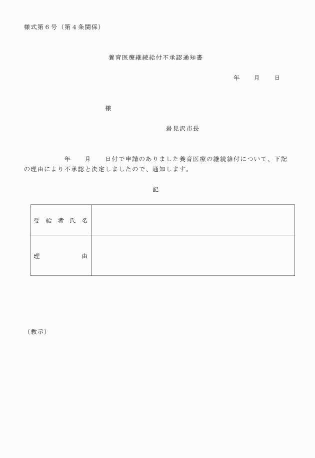 第4条 医療券の交付を受けた者が当該医療券の有効期限を超えて養育医療の給付を受けようするときは、養育医療継続申請書(様式第5号)を市長に提出しなければならない。