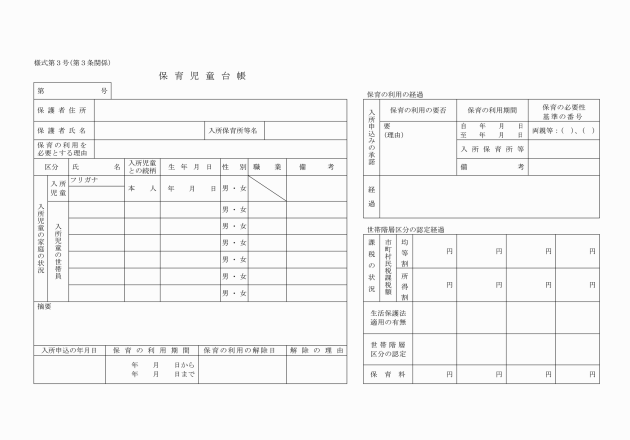 第2条 法第19条第2号又は第3号に掲げる小学校就学前子どもに該当する教育・保育給付認定子どもについて、保育の利用を希望する保護者は、保育所等入所申込書(様式第1号)を市長に提出しなければならない。