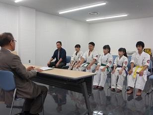 北海道選抜大会で優秀な成績をおさめ、全国大会に出場する訪問者のみなさんが挨拶のため教育長を訪問されました。みなさんは「全国大会に行けない人の分まで力を発揮したい」「今まで戦ったことのないような強い人と戦えることに感謝したい」と大会への意気込みをかたってくれました。