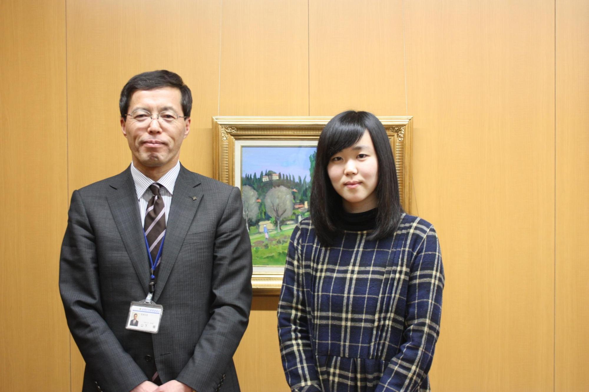 標記大会で優秀な成績をおさめ、全国大会へ出場する岩見沢東高等学校2年の川北 千春さんが挨拶のため教育部長を訪問されました。川北さんは「チェンバロの時代に作られたバッハの曲をピアノで演奏することは、曲の強弱の付け方や曲への解釈などを自分なりに追求する必要があるので難しい。でもそれがやりがいでもあると思う。」とバッハの魅力を語り、「今年は金賞を目指したい」と全国大会への意気込みを語ってくれました。