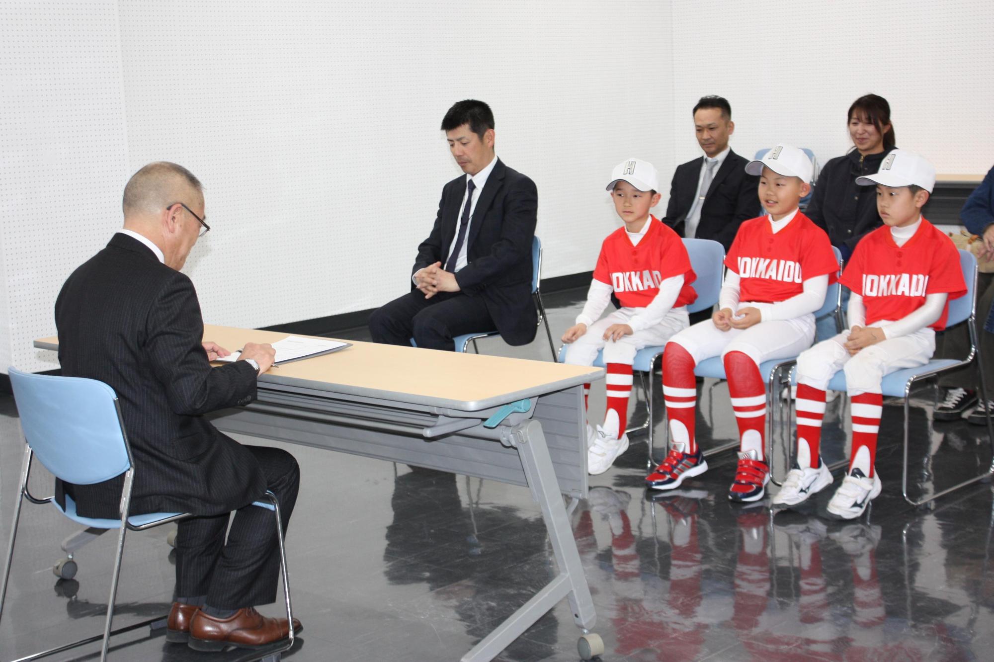 標記大会に北海道代表として選出されたみなさんが教育長を訪問されました。大会に向けて「バッティングを頑張りたい」「たくさんアウトを取りたい」などと抱負を語ってくれました。