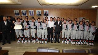 4月26日~6月12日に開催された第18回春季全道大会で3位に入賞し、7月26日から九州で開催される全国大会への出場権を獲得、また、6月20日~7月3日に開催された第38回日本選手権大会北海道大会で準優勝し、8月2日から東京都で開催される全国大会への出場権を獲得した岩見沢リトルシニアの選手の皆さんが、報告のために市長、教育長を訪問しました。