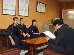 全道大会で優秀な成績を収め、標記大会に出場する岩見沢幌向剣道クラブと光陵中学校剣道部の代表として3人の選手が、報告のため教育長を訪問されました。