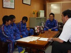 空知予選大会で優勝し、標記全道大会に出場する東FCの代表として3人の皆さんが、報告のために教育長を訪問されました。出場する3人は「今まで練習してきた成果を出し、優勝目指して頑張りたい」と抱負を語ってくれました。