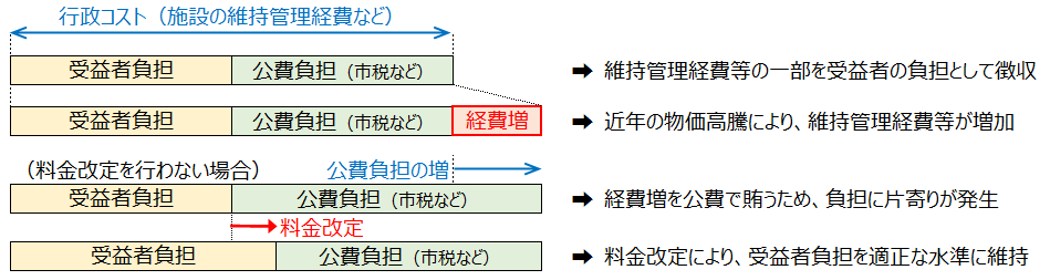 公共施設の運営やサービスをするために、経費の一部を受益者の負担としていますが、物価高騰などにより経費が増加しているため、公費(市税など)の負担が大きく上昇しています。そこで、公共施設やサービスを利用する方としない方との公平性を確保するため、受益者負担率を適正な水準に改めます。